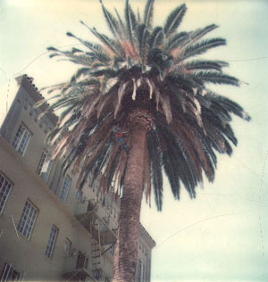 Trimming going well, these palms are harder to climb because of the thickness, and the trunks are harder wood. Picture taken in 1976.